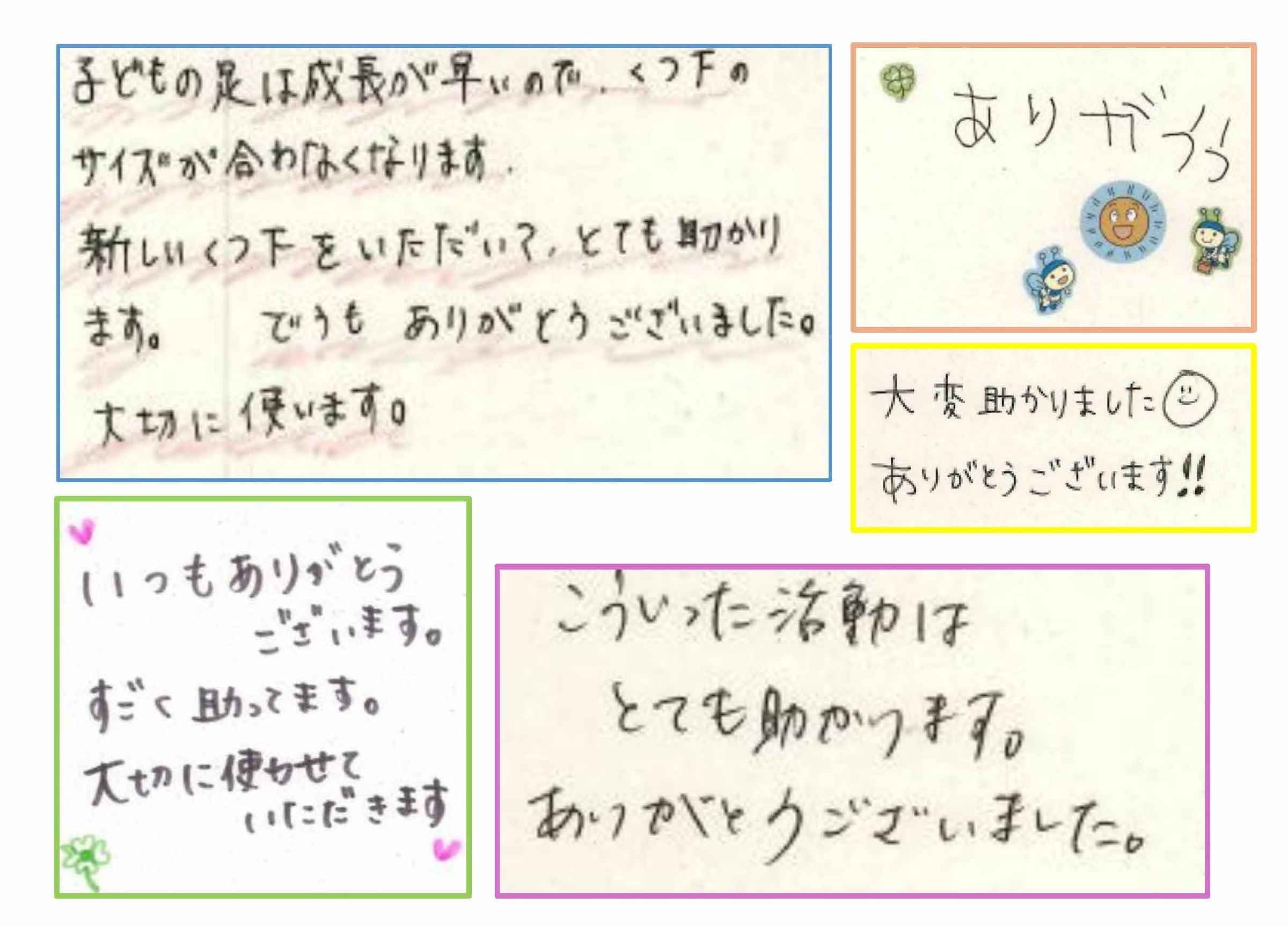 衣類を受け取った方からは、「子どもがどんどん大きくなり、あっという間にサイズアウトしてしまうのでとても助かります」「ベビー服は着替えがたくさん必要なので助かります」「ズボンに穴があいているのをはかせていたので、明日から履かせたいです」など、たくさんのメッセージをいただきました。
